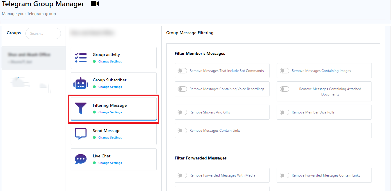 This section plays a pivotal role in group management, aiding in member organization and facilitating message filtering within your group. You have the ability to filter messages from group members using options such as `Filter Member`s Messages,` `Filter Forwarded Messages,` `Keyword Surveillance,` `Admin Filtered Messages,` `Service Messages,` `New Member Restrictions,` and `Member Message Limits`.