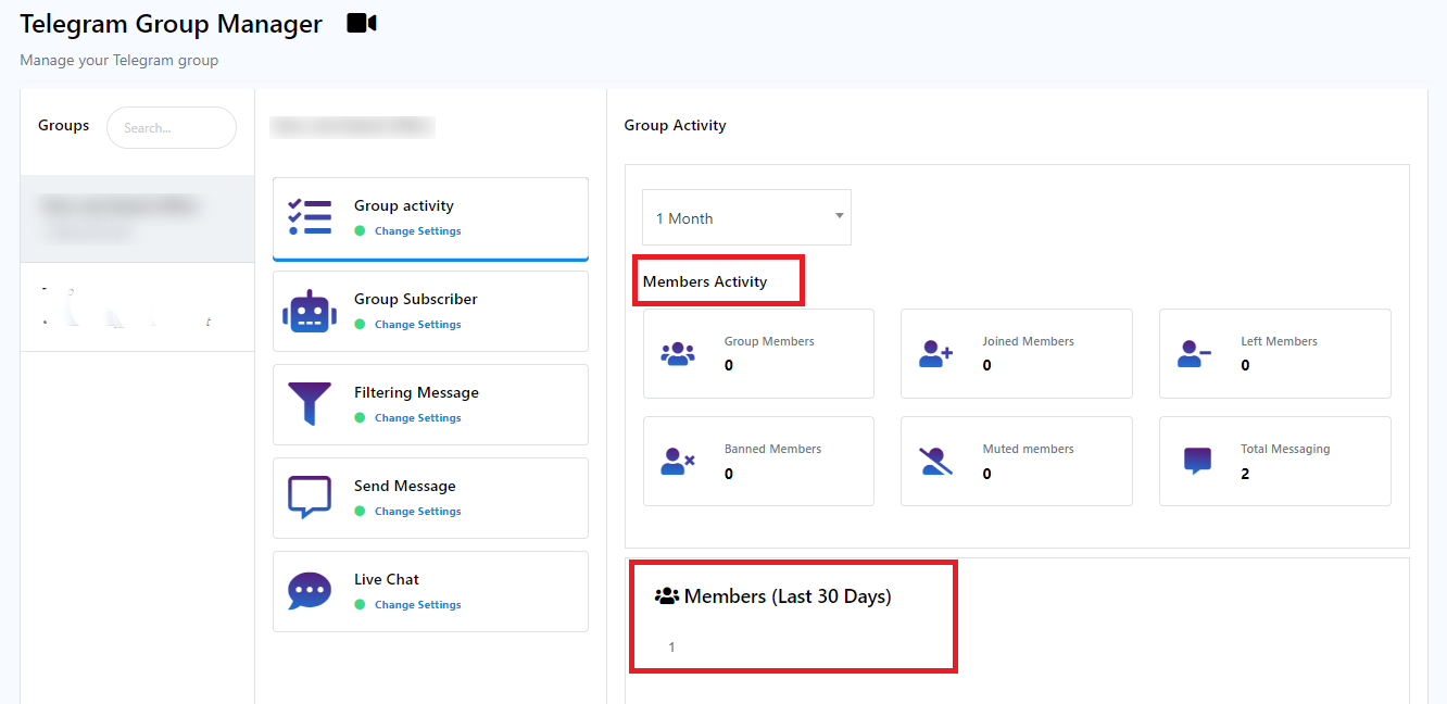 Group Activity is a valuable feature that enables you to monitor the engagement levels and interactions of members within your Telegram group. It offers insights into various metrics,capturing a comprehensive overview of your group`s dynamics.