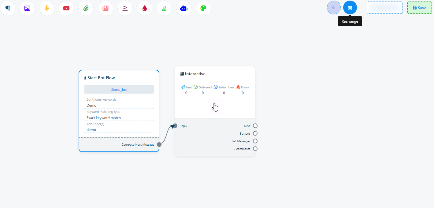 16. Once you`ve completed the `Start Bot Flow` setup, you`ll encounter a sockets: `Compose Next Message`, These sockets allow you to add various components and configure them.