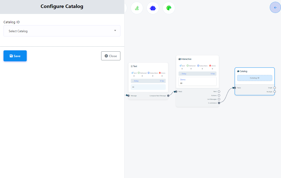 2. After adding the `Catalog` element to your flow, Double-click on the catalog element. This will reveal the `Catalog ID` field, allowing you to input your WhatsApp catalog id.
